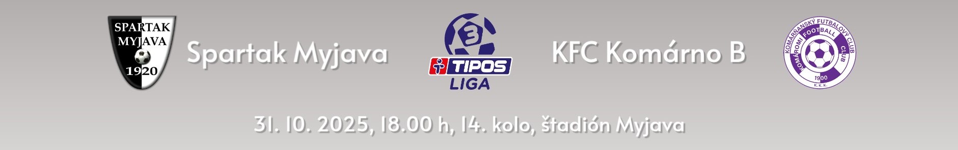 Spartak Myjava vás srdečne pozýva na posledný jesenný domáci zápas 14. kola TIPOS 3. ligy - skupiny Západ 2025/2026. V ňom sa futbalisti Spartaka Myjava stretnú s tímom KFC Komárno B. Stretnutie sa uskutoční na myjavskom štadióne v piatok 31. októbra 2025 o 18.00 h. Príďte povzbudiť našich hráčov v tomto dôležitom dueli!