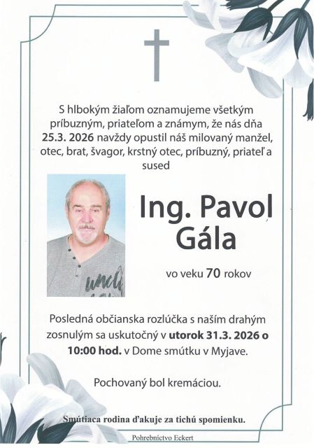 S pánom Gálom sa navždy rozlúčime v utorok 31. marca 2026 o 10.00 h v Dome smútku na Myjave.